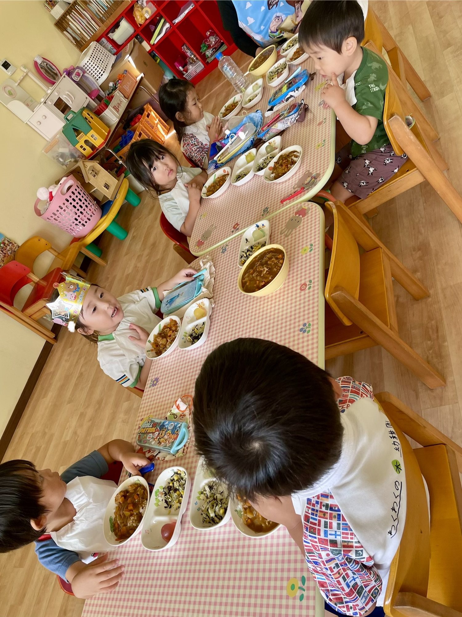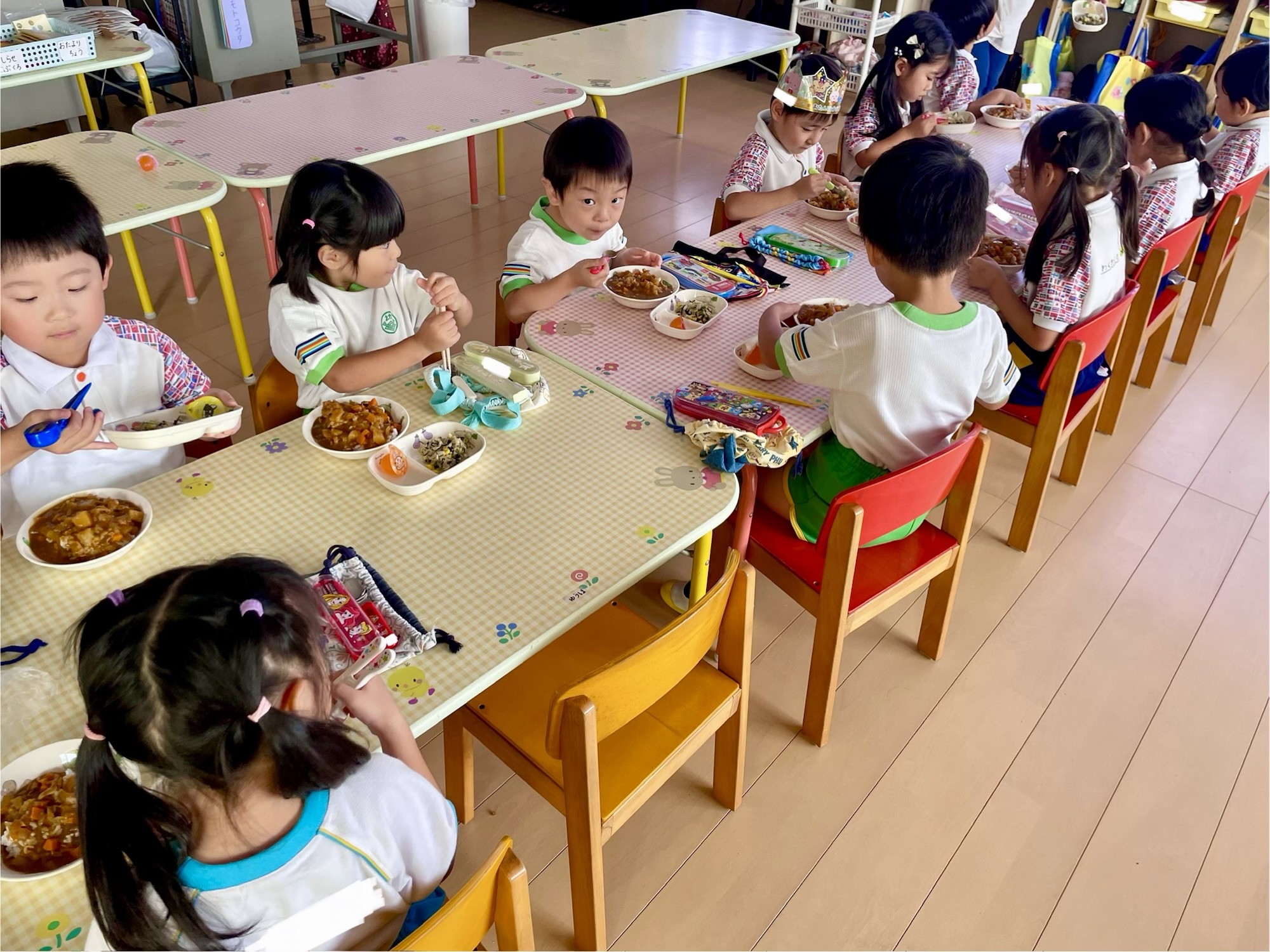 給食の時間には王様・女王様カレー🍛を王冠👑を被ってみんなの真ん中に座って楽しみました😄